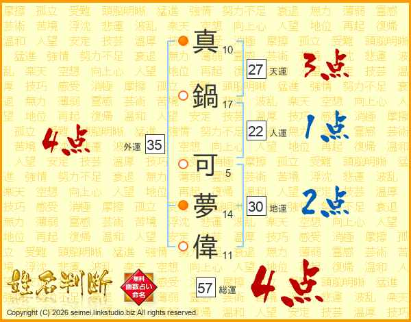 真鍋可夢偉さんの総運は57画の4点!