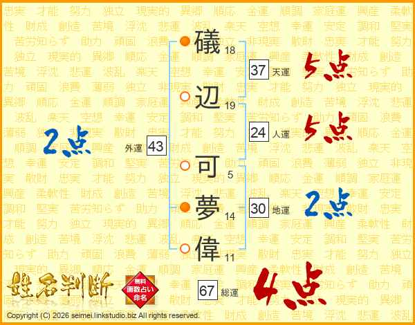 礒辺可夢偉さんの総運は67画の4点!