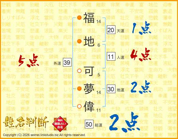 福(14画)地(6画) 可(5画)夢(14画)偉(11画)