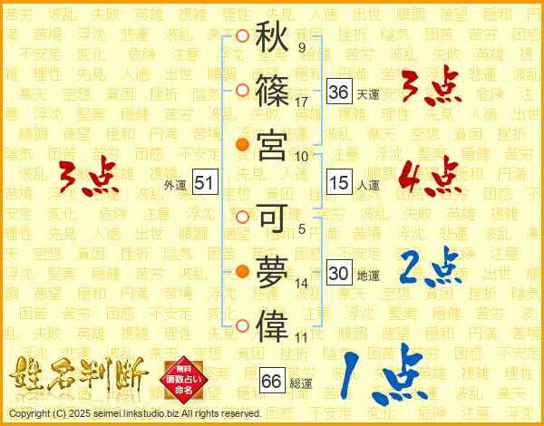 秋(9画)篠(17画)宮(10画) 可(5画)夢(14画)偉(11画)