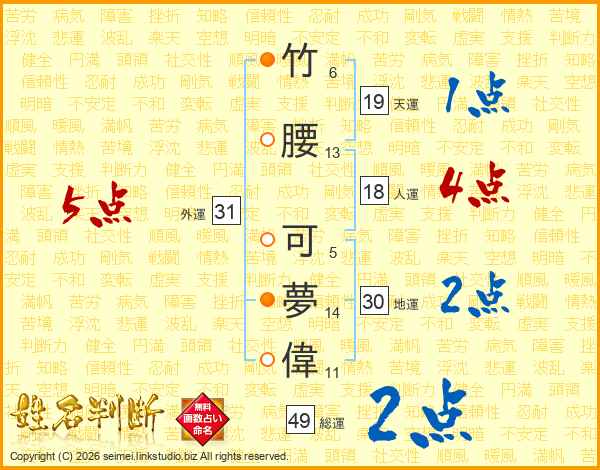 竹(6画)腰(13画) 可(5画)夢(14画)偉(11画)