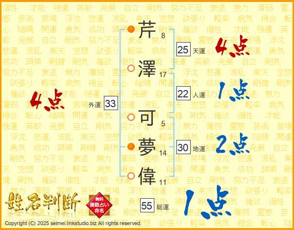 芹(8画)澤(17画) 可(5画)夢(14画)偉(11画)