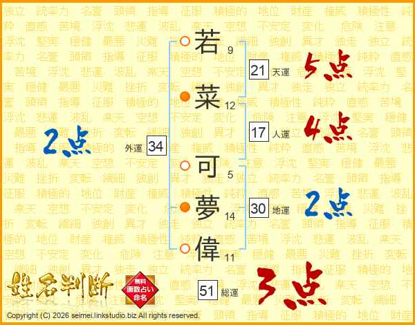 若(9画)菜(12画) 可(5画)夢(14画)偉(11画)