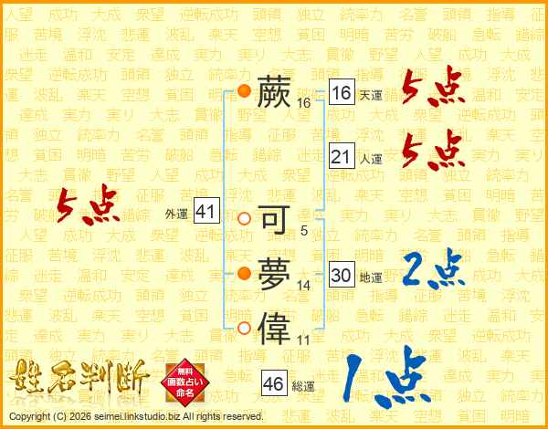 蕨(16画) 可(5画)夢(14画)偉(11画)