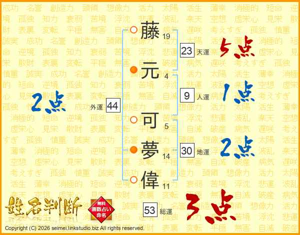 藤(19画)元(4画) 可(5画)夢(14画)偉(11画)