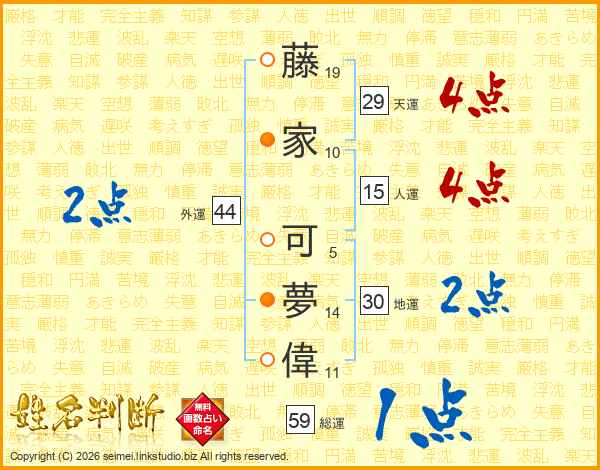 藤(19画)家(10画) 可(5画)夢(14画)偉(11画)