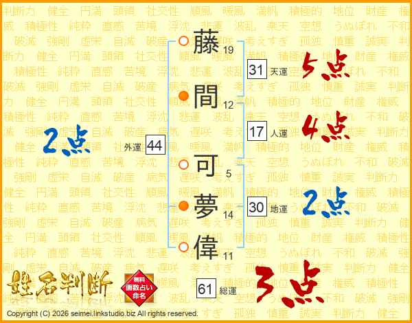 藤間可夢偉さんの外運は44画の2点!