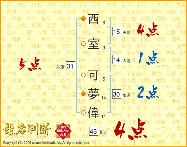 西(6画)室(9画) 可(5画)夢(14画)偉(11画)
