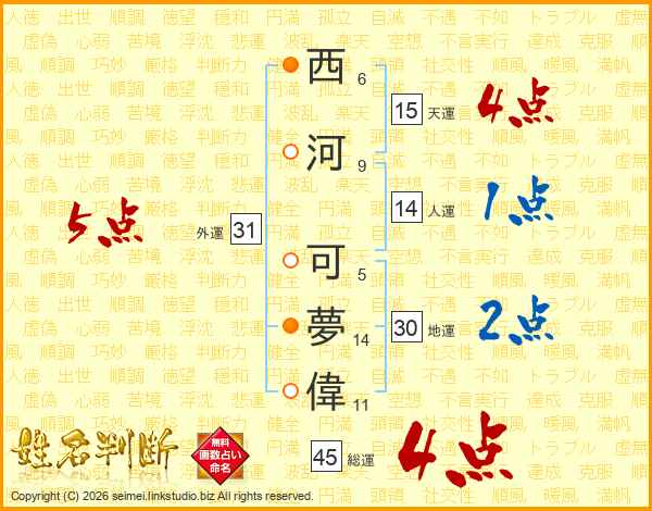 西(6画)河(9画) 可(5画)夢(14画)偉(11画)