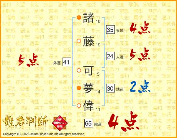 諸藤可夢偉さんの総運は65画の4点!