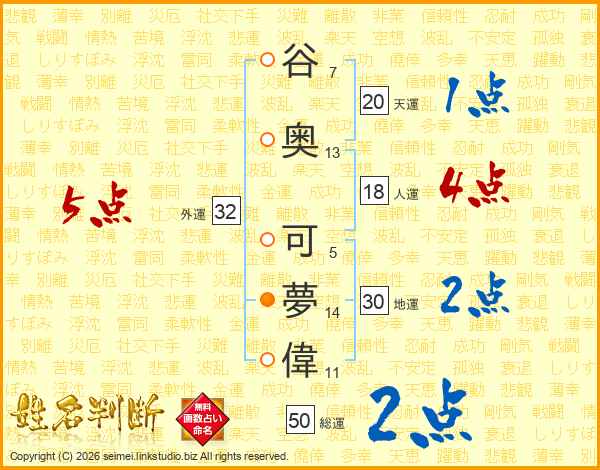谷(7画)奥(13画) 可(5画)夢(14画)偉(11画)