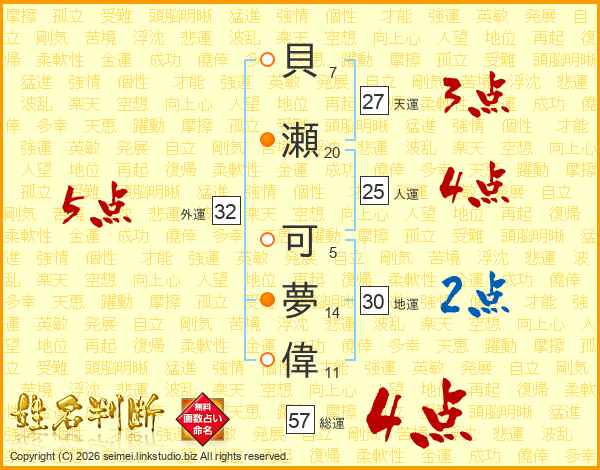 貝(7画)瀬(20画) 可(5画)夢(14画)偉(11画)