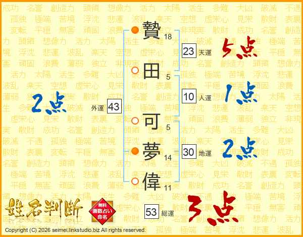 贄(18画)田(5画) 可(5画)夢(14画)偉(11画)