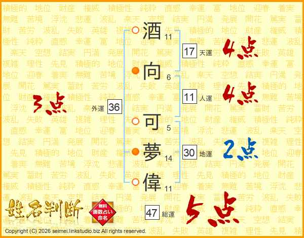 酒向可夢偉さんの総運は47画の5点!