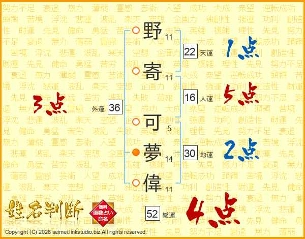 野(11画)寄(11画) 可(5画)夢(14画)偉(11画)