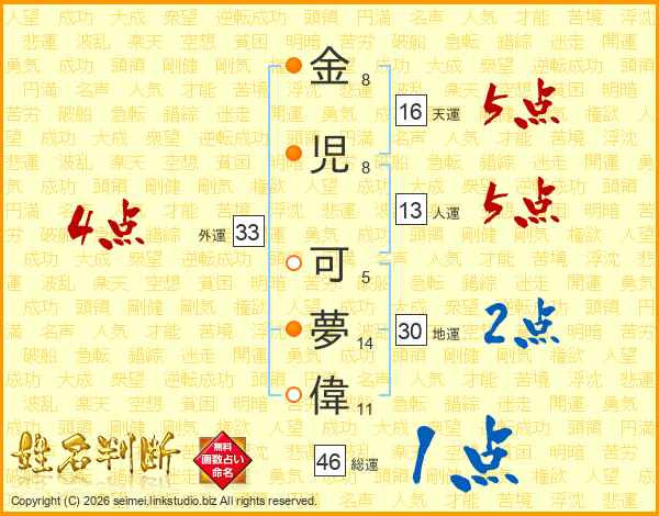 金(8画)児(8画) 可(5画)夢(14画)偉(11画)