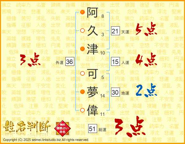 阿(8画)久(3画)津(10画) 可(5画)夢(14画)偉(11画)
