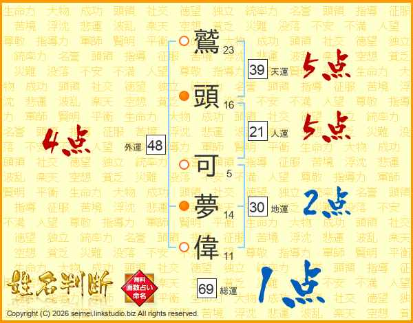 鷲(23画)頭(16画) 可(5画)夢(14画)偉(11画)
