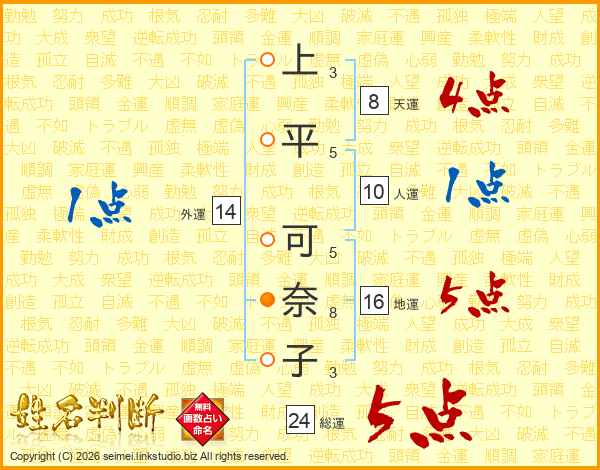 上平可奈子さんの外運は14画の1点!