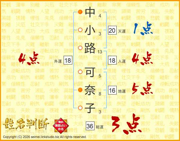 中(4画)小(3画)路(13画) 可(5画)奈(8画)子(3画)
