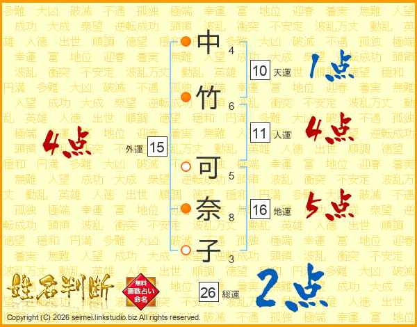 中竹可奈子さんの総運は26画の2点!