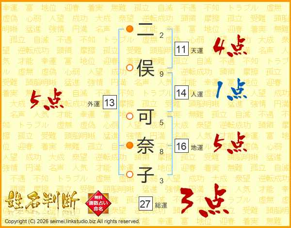 生活面を象徴する運勢です。外部から受ける影響力を表し、結婚運、家庭運や職場、環境への順応性を表します。総運から人運を引いた画数。姓や名が1文字の場合を除く。
