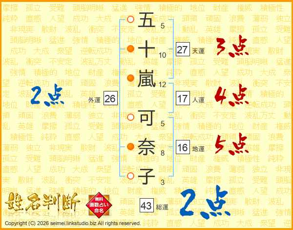 五(5画)十(10画)嵐(12画) 可(5画)奈(8画)子(3画)
