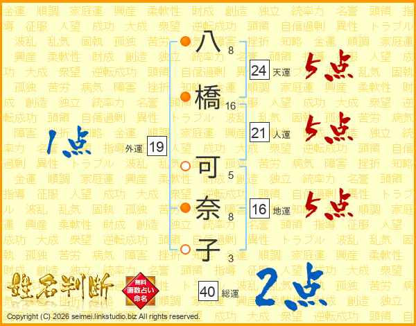 八(8画)橋(16画) 可(5画)奈(8画)子(3画)