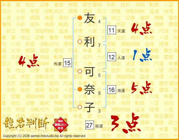 友(4画)利(7画) 可(5画)奈(8画)子(3画)