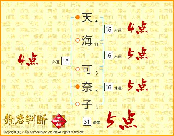 天(4画)海(11画) 可(5画)奈(8画)子(3画)