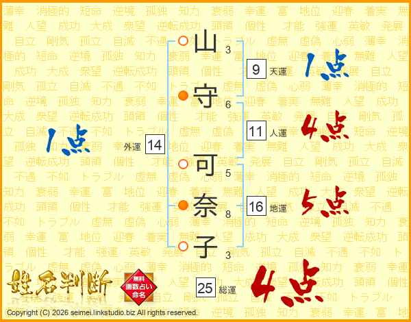 山(3画)守(6画) 可(5画)奈(8画)子(3画)