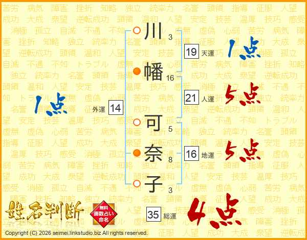 川(3画)幡(16画) 可(5画)奈(8画)子(3画)