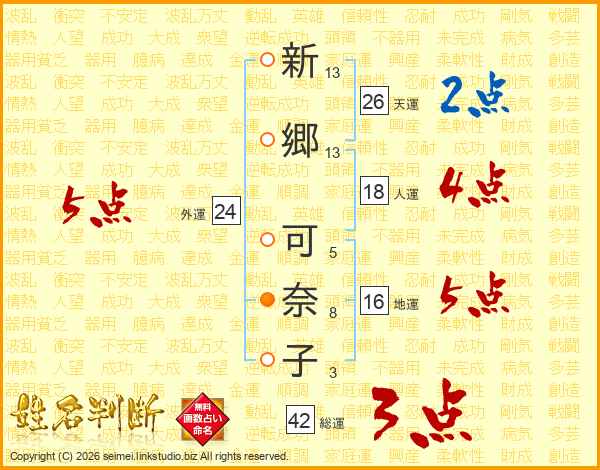 新(13画)郷(13画) 可(5画)奈(8画)子(3画)