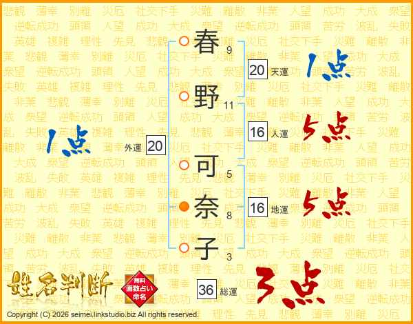 春(9画)野(11画) 可(5画)奈(8画)子(3画)