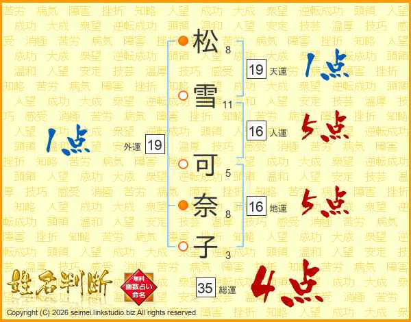 松(8画)雪(11画) 可(5画)奈(8画)子(3画)