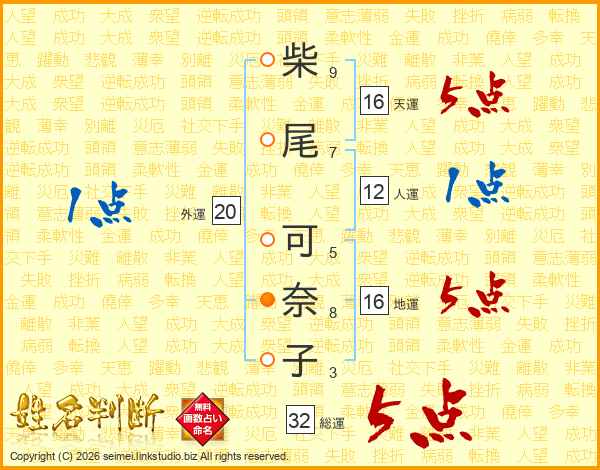 柴(9画)尾(7画) 可(5画)奈(8画)子(3画)