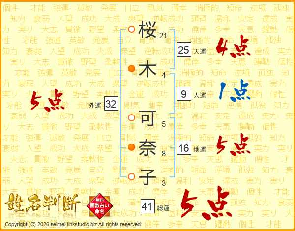 桜(21画)木(4画) 可(5画)奈(8画)子(3画)