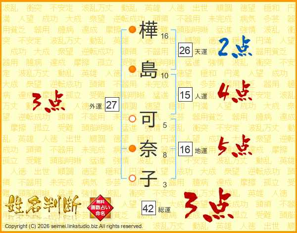 樺(16画)島(10画) 可(5画)奈(8画)子(3画)