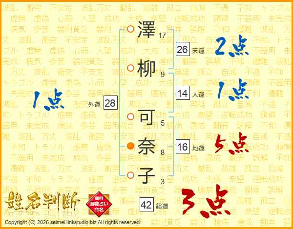 澤(17画)柳(9画) 可(5画)奈(8画)子(3画)