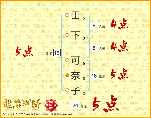 田(5画)下(3画) 可(5画)奈(8画)子(3画)