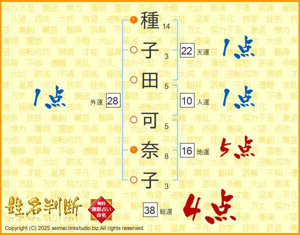 種(14画)子(3画)田(5画) 可(5画)奈(8画)子(3画)