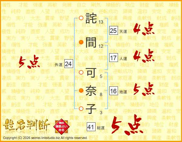 詫(13画)間(12画) 可(5画)奈(8画)子(3画)