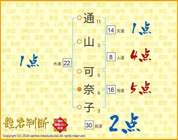 通(11画)山(3画) 可(5画)奈(8画)子(3画)