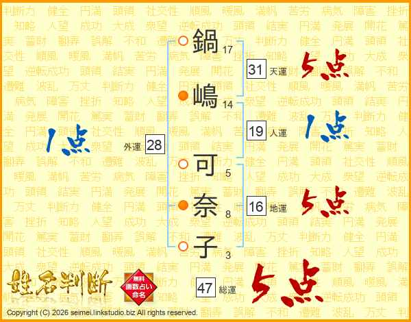 鍋(17画)嶋(14画) 可(5画)奈(8画)子(3画)