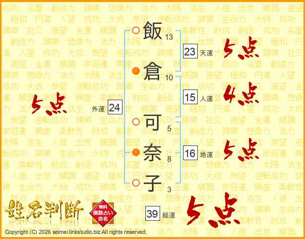 飯倉可奈子さんの総運は39画の5点!