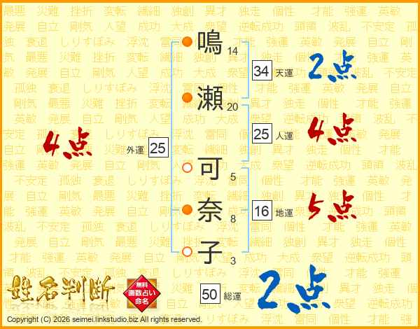 鳴(14画)瀬(20画) 可(5画)奈(8画)子(3画)