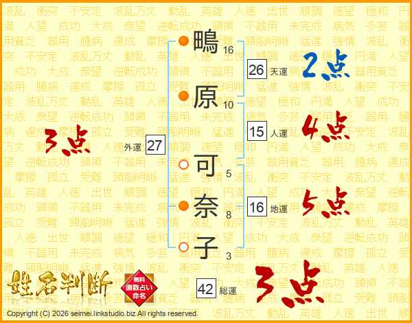鴫(16画)原(10画) 可(5画)奈(8画)子(3画)