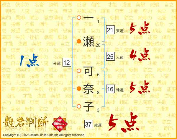 一(1画)瀬(20画) 可(5画)奈(8画)子(3画)