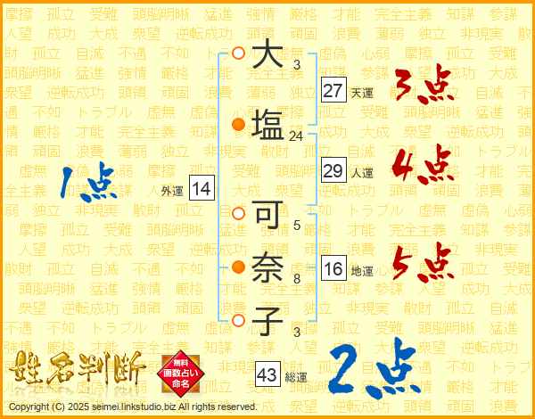 大(3画)塩(24画) 可(5画)奈(8画)子(3画)