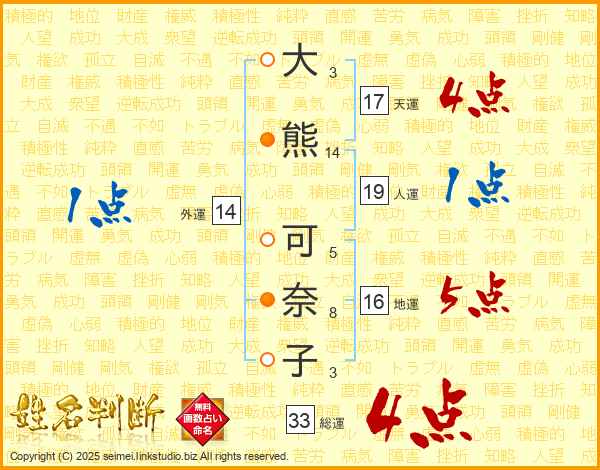 大(3画)熊(14画) 可(5画)奈(8画)子(3画)
